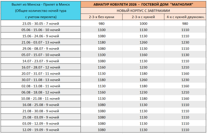 - Авиаперелёт Минск-Батуми/Кутаиси-Минск (багаж 23 кг. + 10 кг. ручная кладь на каждого туриста);