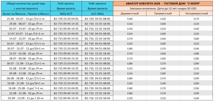 - Авиаперелёт Минск-Кутаиси-Минск (багаж 23 кг. + 10 кг. ручная кладь на каждого туриста);